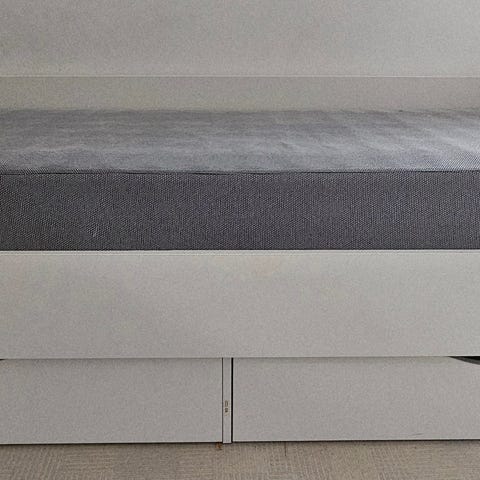 Tillhörande sänggavel och ben ingår och bäddmadrassen skänkes om så önskas, annars får den åka till tippen.