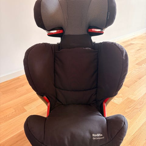 Röd bälteskudde från Maxi-Cosi med justerbart nackstöd som kan anpassas ju mer barnet växer. Sitsen står på en svart bas och har mjuk, vadderad klädsel. Isofix koppling. Ryggstöd kan fällas i två olika lägen.