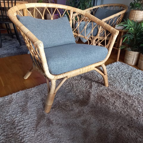 Rottingen har en härlig organisk känsla. Fåtöljen passar de flesta ställen i hemmet; på verandan en solig dag, inomhus med en god bok, i barnrummet, eller framför favoritfilmen! Obs! Avsedd för inomhusbruk. Vid användning utomhus passar möbeln bäst i ett uterum eller på en veranda med tak och väggar. Bör ej lämnas utomhus. Vi har tagit ut den vi enstaka soliga dagar. Kan sprayas med en klarlack för att försegla ytan.