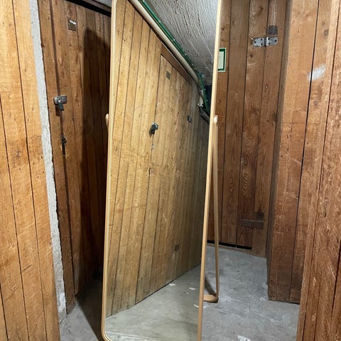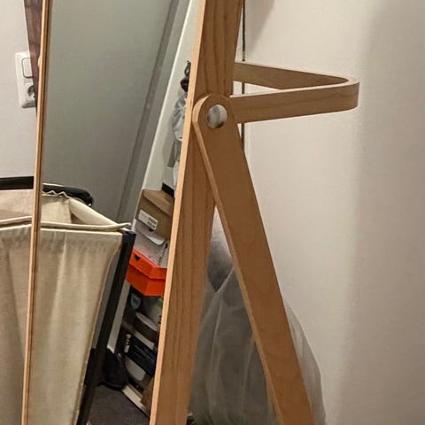 Fristående spegel från IKEA med träram och praktiskt stödben. Smidig att ställa var som helst i rummet och lätt att flytta runt.