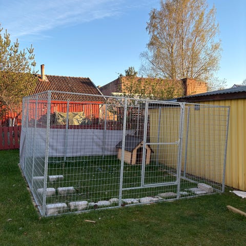 Hundgård i metallnät med grind och flera sektioner. Inne i gården finns en grå hundkoja med öppning fram och snedtak. 5 galler sektioner plus 1 dörr. Monteras ner för avhämtning. Hundkoja ingår om man vill.
