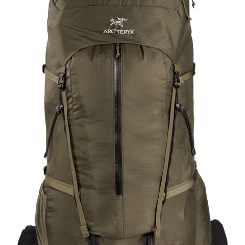 Quechua vandringsryggsäck i grått med blå remmar och flera justerbara spännen. Har höftbälte, flera fack och remmar på sidorna för extra packning.