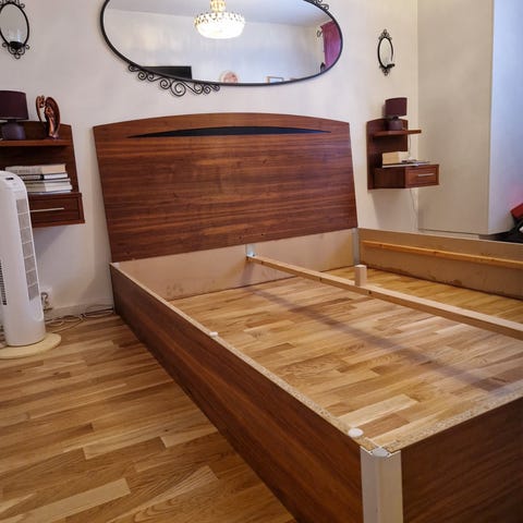 Vintage säng med inbyggd belysning, bandspelare och radio