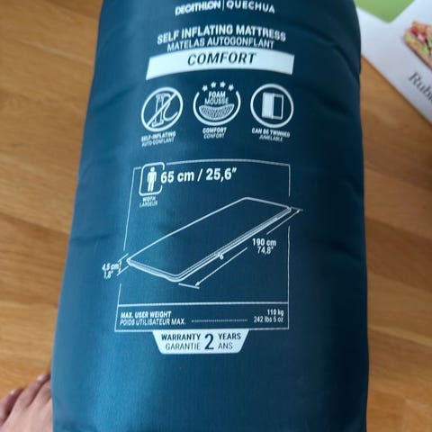 Självuppblåsande liggunderlag från Kayoba i grönt. Rullas ihop med rem och har ventil i ena änden för enkel uppblåsning.