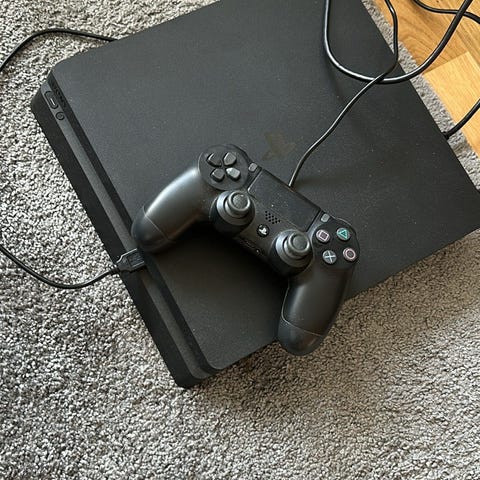 Vit Playstation 4 med matchande design och blå handkontroll, med tre PS4-spel i fodral, bland annat sport- och bilspel. Skickar ej! Finns att hämta i södermalm.