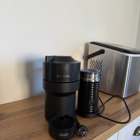 Komplett Nespresso Vertuo Pop kapselmaskin i svart med avtagbart droppgaller framtill. Enkel toppknapp för bryggning och sladd baktill för elanslutning. Även enkel att rengöra!