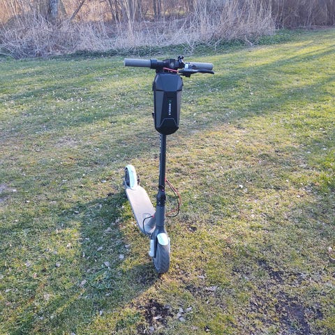 E-Wheels E2S V2 elsparkcykel i grå med svarta detaljer. Har display på styret, fotbroms bak och hopfällbar konstruktion.
