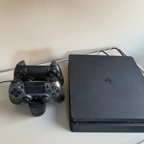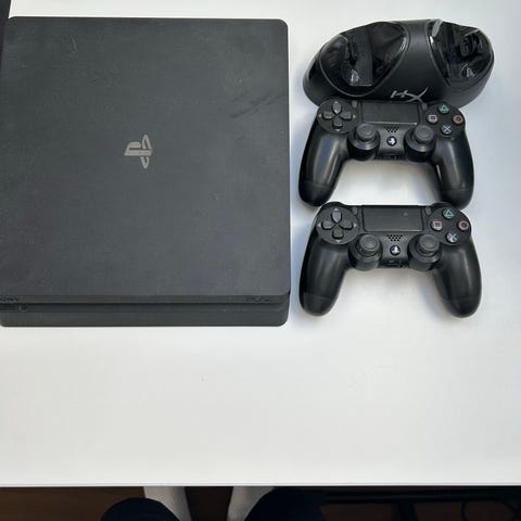 Säljer min välvårdade Playstation 4 Pro med vertikalt stativ för bättre kylning och smidig laddning av dosor.