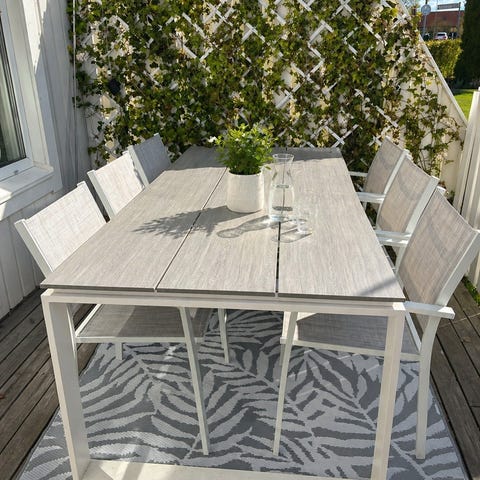 6 stolar med sittdyna. Stolarna är positionstolar så möjliga att fälla ryggen på och då användbara som solstol.