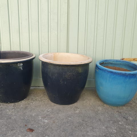 Blandning av terrakotta och glaserade krukor. Vissa har patina och mindre bruksspår, vilket ger en fin rustik känsla.