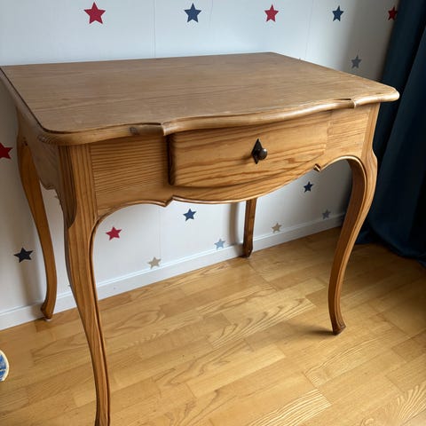 Skrivbord med två små lådor, L 90 x B58 x H75 cm. Tror det är Ikea. Fungerar alldeles utmärkt. Slitet på bordsskivan. Väger inte mycket trots gediget trä, endast lådornas botten är av hårdpapp.