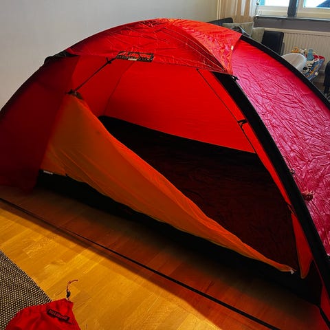 Rött Hilleberg Nallo 3 GT-tält med tunnelkonstruktion och rymlig absid. Extra golv som skydd under sovdelen och täcker hela absiden. Tältet har använts på en vecka i fjällen och en vecka cykelsemester i Danmark. Det finns inga skador, revor eller täcken på slitage. Vi gillar fina och fungerande saker och ta väl han om dem. Inköpt på Naturkompaniet för några år sedan. Vi tältar mest taktält numera och det är synd att den bara ligger och väntar på nya äventyr som aldrig blir av. Fantastiskt tält som ger en trygghet utan jämförelse när det blåser och regnar hårt.