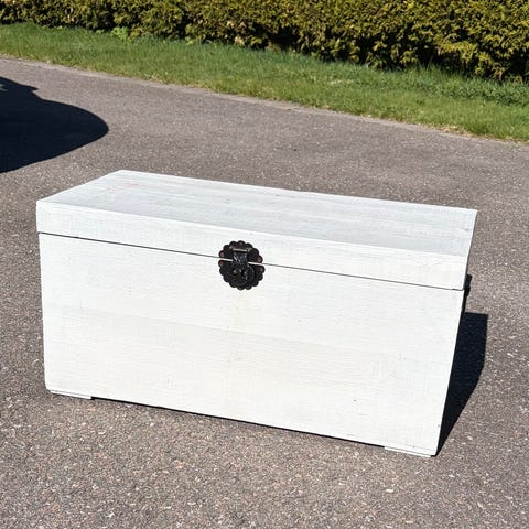 Träkista med patina säljes. En rustik och charmig inredningsdetalj som har åldrats fint genom åren. Vackra järnbeslag och lite naturligt slitage.