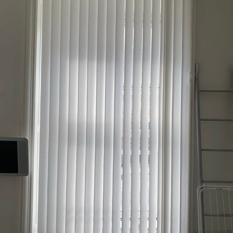Vita lamellgardiner från Jysk, enkla att ha i vardagsrum eller kontor. Säljer hela setet med skenor och lameller som på bilden.