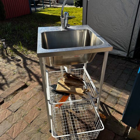 Rostfri arbetsbänk med stor diskho och plan arbetsyta bredvid. Har gallerhylla undertill för förvaring och öppet stativ med fyra ben där fötterna kan regleras.