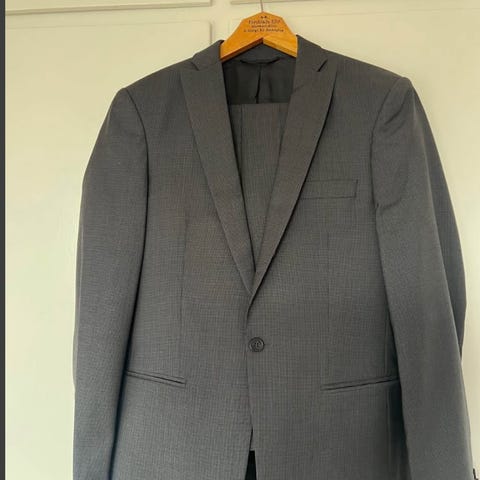 Blå Paule Tux-kostym från J. Lindeberg i ull, stl 46. Kavajen har sjalkrage i blankt tyg, enkelknäppning och två framfickor, byxorna har pressveck och slät front.
