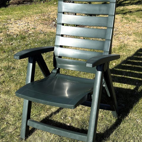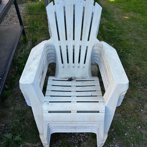 Säljer även fyra gröna plaststolar med armstöd och hög rygg med spjälor. Väldigt sporadiskt använda kan finnas någon skönhetsfläck på