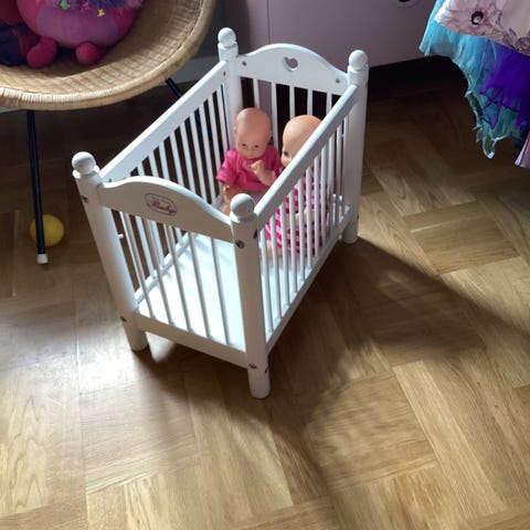 Humble & Heart docksäng och dockstol i vitmålat trä med röda prickar och text på gavlarna. Stabilt set med klassisk spjälsängsmodell och enkel stol med fotsteg.