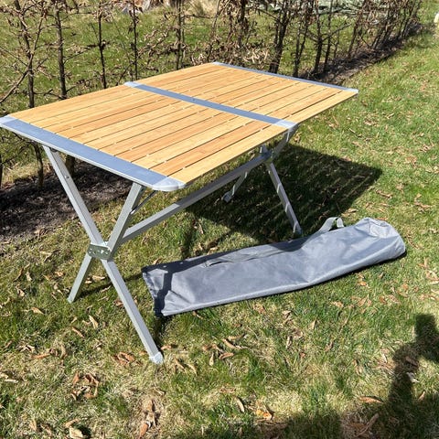 Hopfällbart träbord i brun färg med ribbad skiva. Bordet kan fällas ihop smidigt för att ta mindre plats när det inte används.