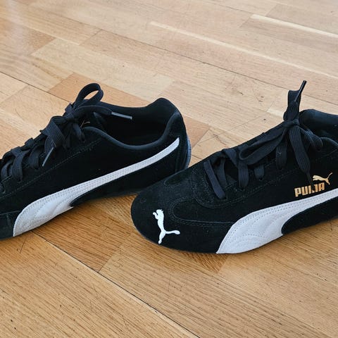 Vita sneakers från Puma i stl 43 med snörning. Diskret perforerad ovandel och logga i guld på sidan.