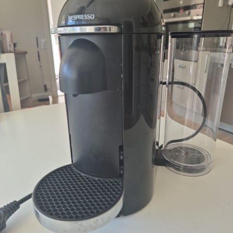Nespresso kapselmaskin i svart och creme med avtagbar vattentank. Har kapselbehållare vid sidan och löstagbart droppgaller framtill. Extra vattentank, kapselbehållare och droppgaller kommer med.