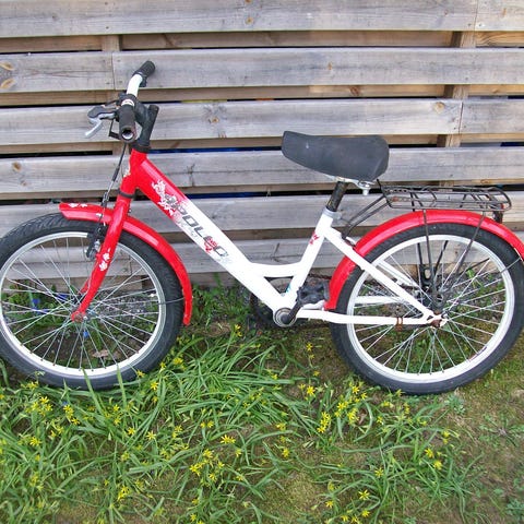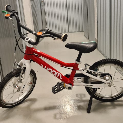 Röd Woom barncykel med 16" hjul och vit framgaffel. Utrustad med stöd, skärmar, ringklocka och handbromsar fram och bak.