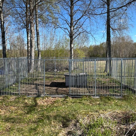 Stor hundgård, ca 40kvm (10x4m) och ca 2m hög. Finns några extra väggar som ej syns på bild.