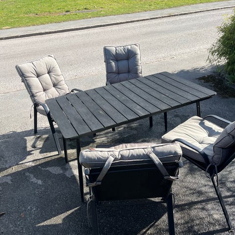 Trädgårdsgrupp i trä med rektangulärt bord och fyra matchande stolar. Stolarna är fällbara och bordet har ribbad skiva som släpper igenom vatten. En stol behöver lite extra kärlek.