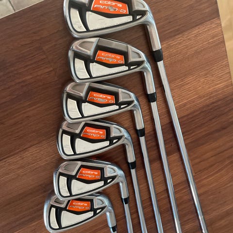 Set med sju järnklubbor, numrerade 5 till 9 samt pitching wedge och sand wedge. Skaft i metall med svarta grepp, redo för bana eller range.
