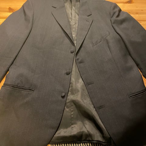 Grå kostym från TM Ledin (märket fanns inte på blocket därför står det Tiger of Sweden) i ull, kavaj i stl XL med två knappar och flera fickor. Matchande kostymbyxa med pressveck och sidfickor ingår i samma set.