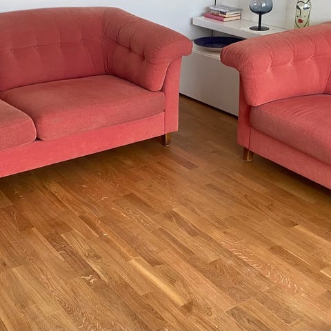 Klädseln är tjock och i bra skick, men något solblekt. Normalt slitage från användning men inga större fläckar eller skador. Säljs utan ben. Fäste för ben är standard (gängat), så det är enkelt att skruva på nya.