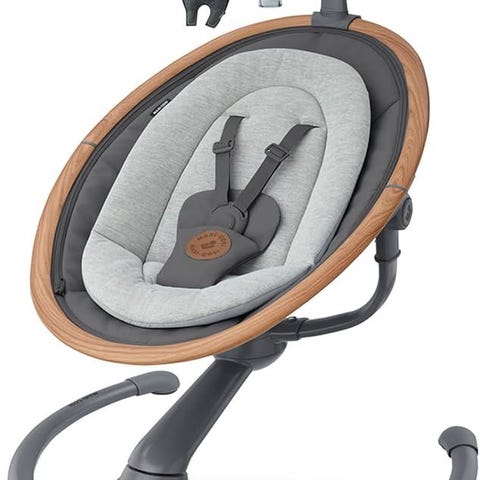Babysitter från Jolie i beige med svart ställning och sele. Har båge med hängande leksaker och justerbart gungläge framtill.
