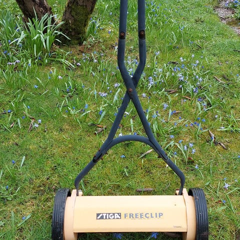 Stiga SCM 240 R handdriven gräsklippare med gul ram och svart handtag. Cylindern och hjulen rullar lätt och klipphöjden kan justeras med reglagen vid hjulen. Handjagare
