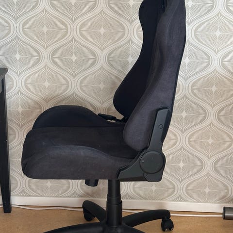 En svart och vit gamingstol i fint skick.