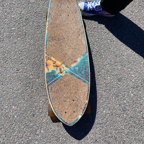 Landyachtz longboard med mönstrad undersida i varma färger. Har gröna hjul och svart griptape på ovansidan.