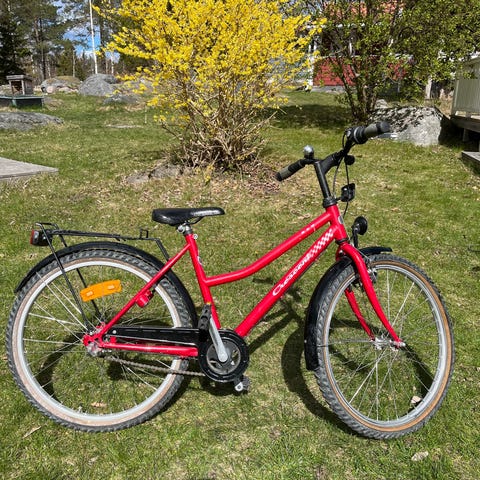 Cykeln är fullt fungerande men med några små skavanker på ena pedalen och kedjeskyddet.