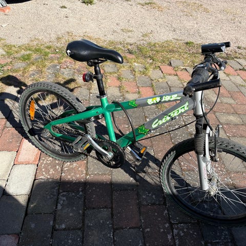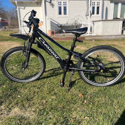 Blå Crescent barncykel med 20" hjul, skärmar och grova däck. Utrustad med handbroms fram, växlar på styret och USB lampor fram och bak