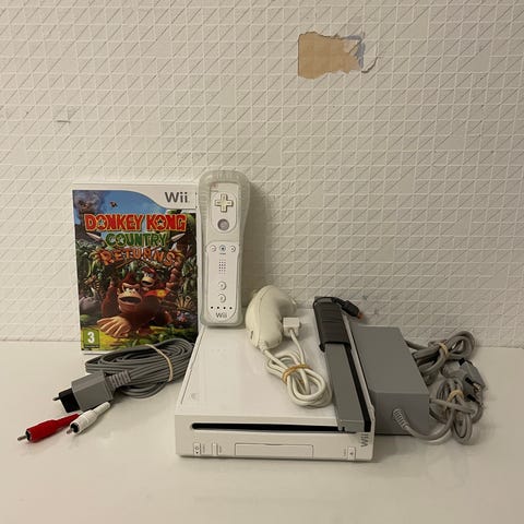 Nintendo Wii vit spelkonsol med två Wii-fjärrkontroller och silikonfodral till en av dem. Allt för wii:n medföljer samt med en gamecube kontroller.