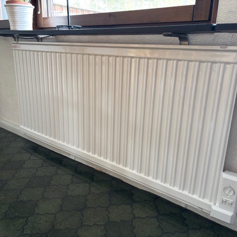 Vit panelradiator med termostatventil och anslutningar i sidan. Säljes avmonterad från hus, mått kan mätas vid intresse.
