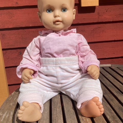 Söt docka med randig tröja och gula hängselbyxor. Tröjan har knäppning bak och byxorna är lätta att ta av och på.