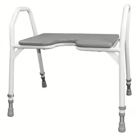 Stabil och bekväm duschstol från Medokare med vadderad sits, ryggstöd och armstöd. Justerbar höjd, halkfri dyna och enkel montering utan verktyg. Med endast 2,1 kg kommer denna duschstol att vara perfekt i alla badrum. Medföljande tygväska i blå. Nytt skick - helt oanvänd.