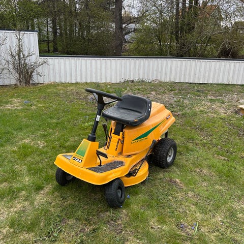 Yard-Man åkgräsklippare med gul huv och grön kaross. Utrustad med bekväm sits, stora däck och klippdäck undertill med varningsdekaler kvar. Lite rost nertill - se bild . Fint skick
