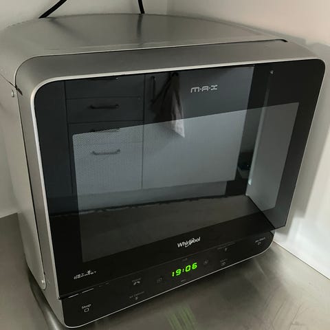 Whirlpool mikrovågsugn i stål med digital panel och touchknappar framtill. Invändigt finns roterande glasskiva och belysning.