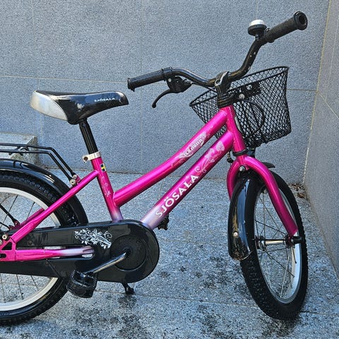 Röd Monark barncykel med 16" hjul, korg fram och pakethållare bak. Kedjeskyddet och sadeln har barnmotiv. Cykeln har stöd, reflexer, ringklocka, hand och fotbroms.