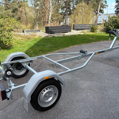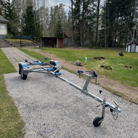 Båttrailer från 2019 med rullar längs hela ramen och justerbara sidostöd. Utrustad med vinschtorn fram, skärmar över hjulen och bakljus med reflexer.