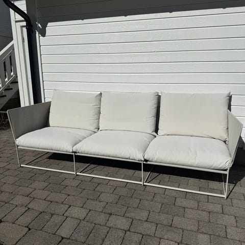 Ikea Havsten 1 tvåsitssoffa (nypris 6600kr) + 2 st fåtöljer (nypris 3550kr/st). Vita loungemöbler med lös sitt- och ryggdyna och vit metallstomme. Sitsen är i tyg på ram och dynorna är tjocka och sköna att sjunka ner i.