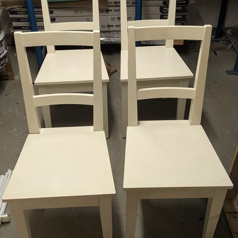 4 vita stolar i använt bra skick, små kantstötningar här och där. Skulle kunna målas om.