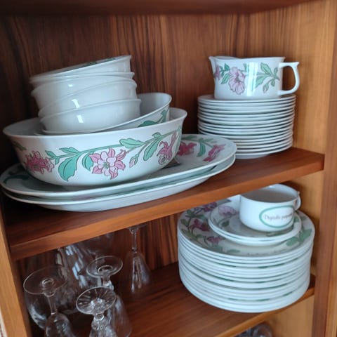 Fina tallrikar från Rörstrand, serien Gunhild, med blommigt dekormönster. Klassisk form med svagt vågig kant och tryckt stämpel undertill. 1940-tal.