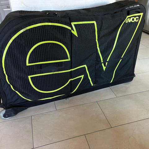 Evoc cykelresväska i svart med gul logga och 4hjul så den är lätt att rulla
