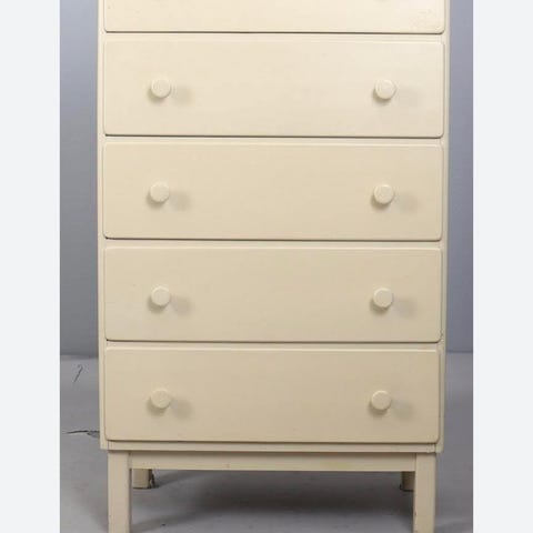 Byrån står stadigt på snedställda ben och har infällda handtag som ger ett rent uttryck. Lådorna är hela och rymmer mycket.